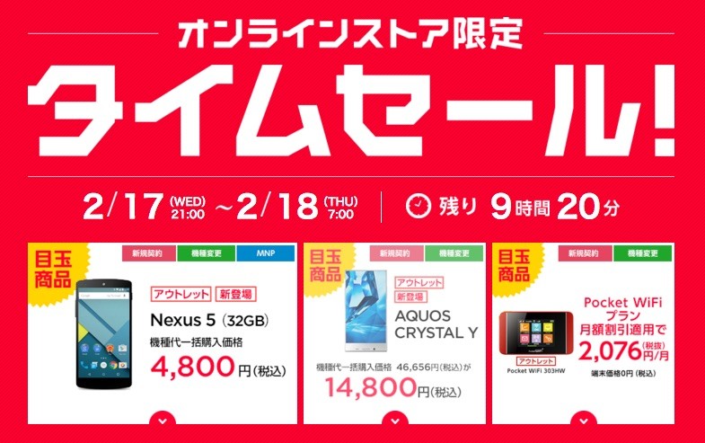 ここ数日毎日行われているこのタイムセールですが、注目は「Nexus 5(型番:EM01L)」の32GBや「AQUOS CRYSTAL Y(型番:402SH)」、「Pocket WiFi 303HW」の3機種とのこと。例えば、Nexus 5の32GBは一括4,800円(税込)で販売されています。