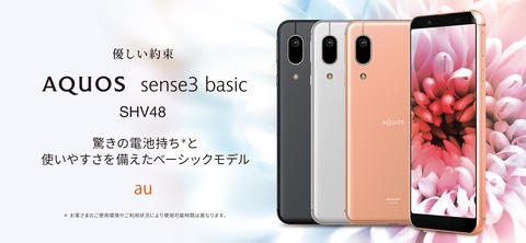 KDDIおよび沖縄セルラー電話は15日、携帯電話サービス「au」向けの新しいスタンダードスマートフォン(スマホ)「AQUOS sense3 basic SHV48」(シャープ製)を2020年6月19日(金)に発売すると発表しています。