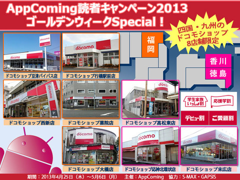 既報通り、AppComing(アップカミング)は、2013年4月25日(木)~2013年5月6日(月)の期間に四国(徳島・香川)および九州(福岡)のドコモショップ8店舗の協力によってNTTドコモが発売しているAndroidタブレットおよびスマートフォン、モバイルWi-Fiルーターなどを安く購入できる「AppComing読者キャンペーン2013ゴールデンウィークSpecial」を実施しています。