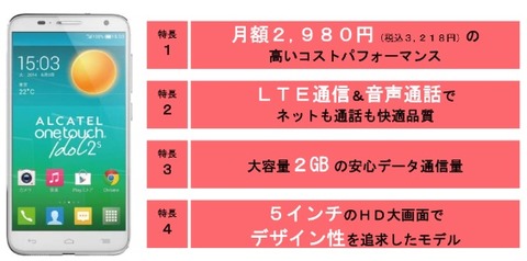 イオンは1日、ビックローブと協業により、同社が展開するスーパー「イオン(AEON)」などにて販売している「イオンスマホ」の第3弾として高速通信規格「LTE(FDD-LTE)」に対応したAndroidスマートフォン「ALCATEL ONETOUCH IDOL 2 S」(TCL製)を3万台限定で2014年9月5日(金)より販売開始すると発表しています。発売に先駆けて、9月2日(火)より事前予約受付を開始します。