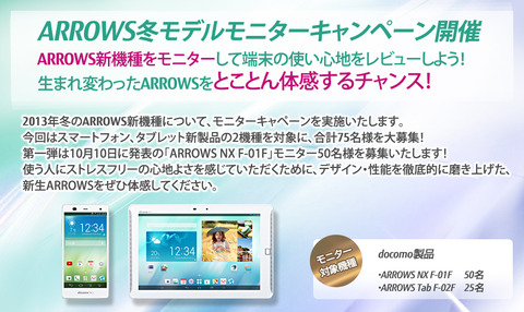 NTTドコモは22日、今冬および来春に発売および開始する予定の「2013-2014冬春モデル」のうちのAndroid 4.2(開発コード名:Jelly Bean)を採用した10.1インチサイズのタブレット「ARROWS Tab F-02F」(富士通製)を2013年11月29日(金)に発売するとお知らせしています。