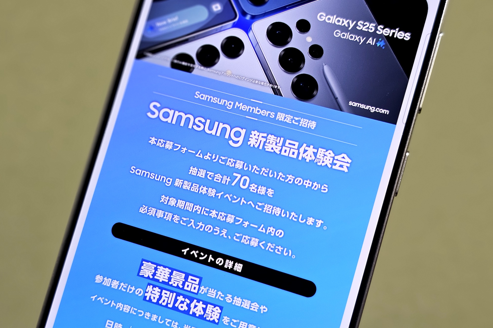 応募した人の中から抽選で80人が参加でき、応募はSamsung Membersアプリから行い、応募期限は2026年2月24日(火)23:59までとなっており、イベントでは参加者全員に新製品が貸し出されるほか、豪華景品が当たる抽選会や参加者だけの特別な体験が用意されているとのこと。新製品は具体的に明記されていませんが、恐らく新製品発表会において次期フラッグシップスマートフォン(スマホ)「Galaxy S26」シリーズが発表されると思われ、日本でもGalaxy S26シリーズの「Galaxy S26」および「Galaxy S26+」、「Galaxy S25 Ultra」が販売される見込みなので、これらのせいひんがメインとなるのではないかと思われます。