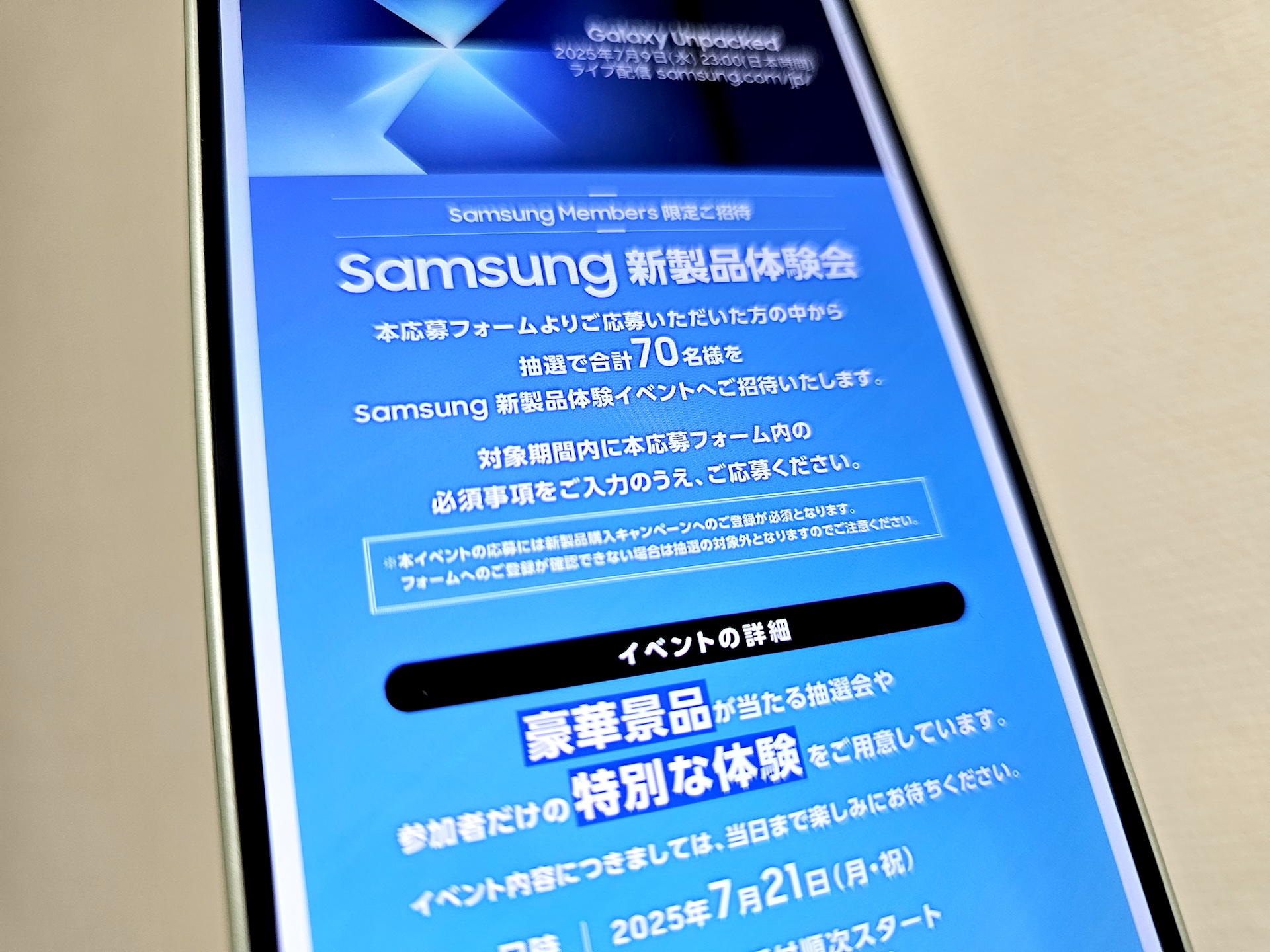 さらにイベント中は会場の様子の撮影を行う予定となっているため、その際に会場内の参加者が映り込む場合があるのでご注意ください。その他、詳細は応募ページや応募規約などをご確認ください。その他、同社ではこれまでにもグローバル向け新製品発表会が行われた翌朝から新製品をGalaxyの世界最大級なショーケース/旗艦店「Galaxy Harajuku」や体験スペース「Galaxy Studio Osaka」などで展示してきているため、今回もイベントに参加できなくても発売前に先行してタッチ&トライはできると思われます。