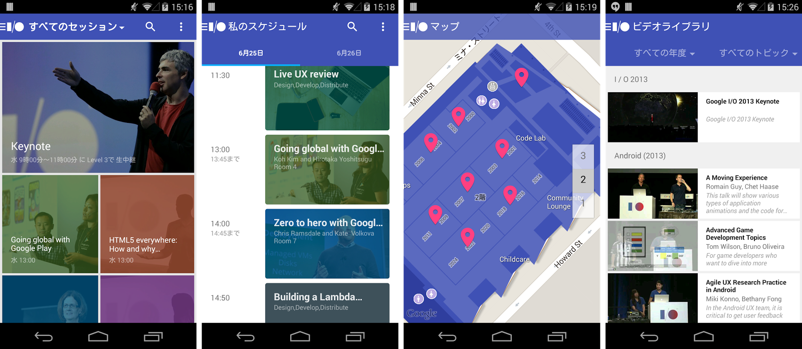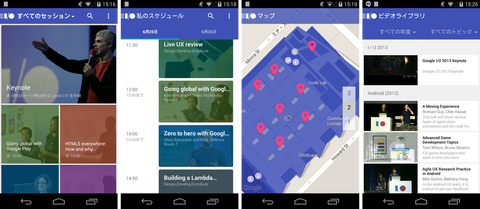このアプリでは参加するセッションや会場の地図を確認できるほか、ビデオライブラリーという新機能によって過去の「Google I/O」の基調講演やセッションなどの映像を見ることもできるようになっています。