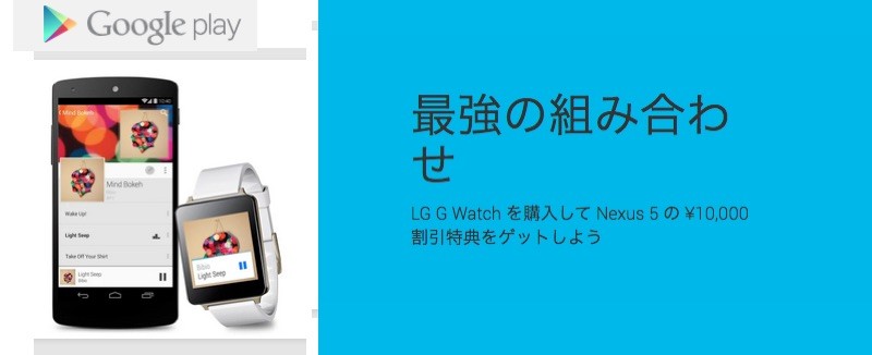 Google(グーグル)が日本の直営Webショップ「Google Playストア」にて同社ブランドのスマートフォン「Nexus 5(型番:LG-D821)」(LGエレクトロニクス製)および同社が開発するウェアラブルデバイス向けプラットフォーム「Android Wear」を搭載したスマートウォッチ「LG G Watch」(LGエレクトロニクス製)を同時購入すると10,000円を割り引くキャンペーンを実施しています。