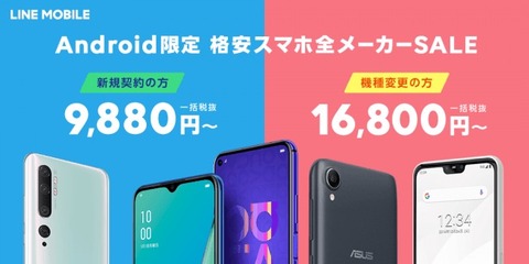ソフトバンク傘下のLINEモバイルは1日、同社が移動体通信事業者(MNO)から回線を借りて仮想移動体通信事業者(MVNO)として提供する携帯電話サービス「LINE MOBILE」( https://mobile.line.me )において対象製品を値引きして販売するキャンペーン「Android限定!格安スマホ全メーカーセール」を2020年4月1日(水)11:00から5月13日(水)10:59まで実施すると発表しています。