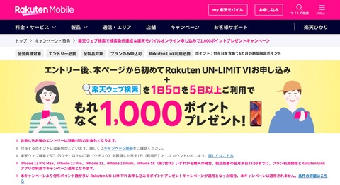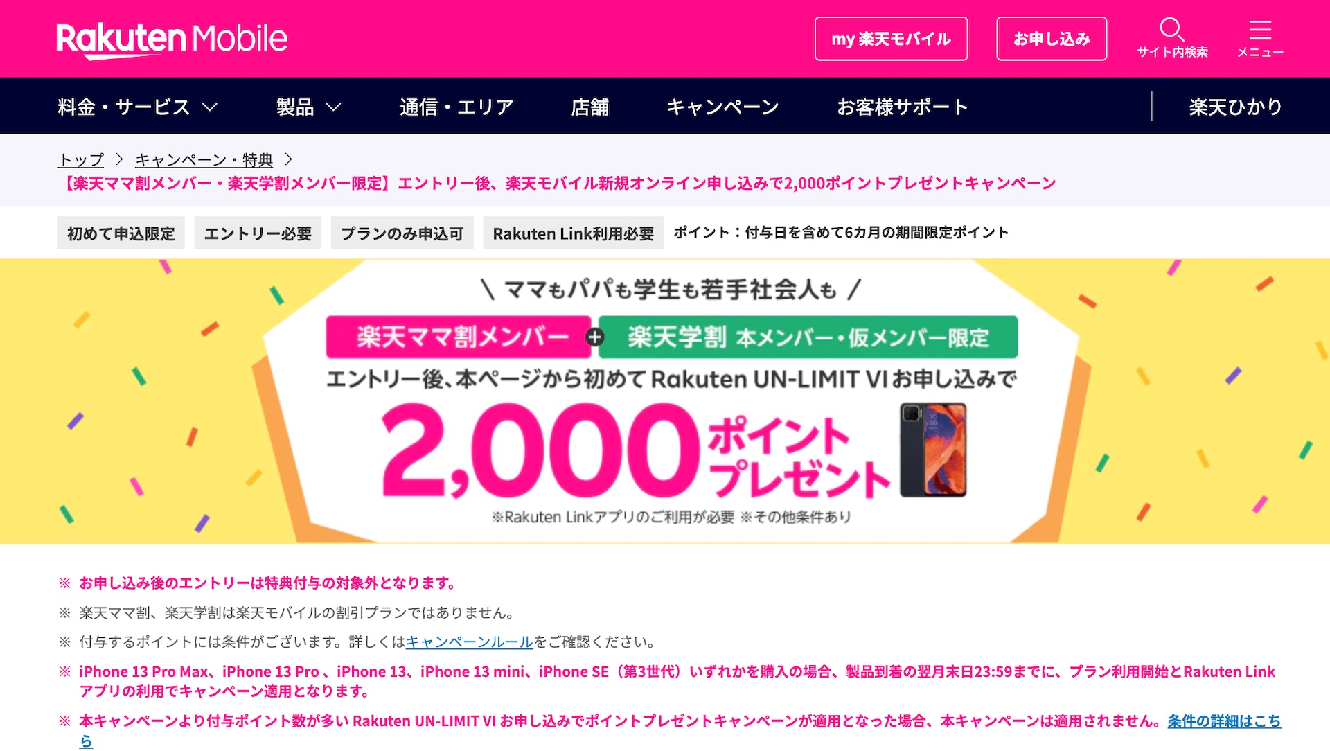 キャンペーンでは「楽天ママ割」および「楽天学割」(本メンバー・仮メンバー)の会員がキャンペーンWebページからエントリー後に初めてRakuten UN-LIMIT VIを申し込んだ場合に楽天ポイントで2,000ポイントがプレゼントされています。ポイント付与日は条件達成月の3カ月後の末日頃を予定。