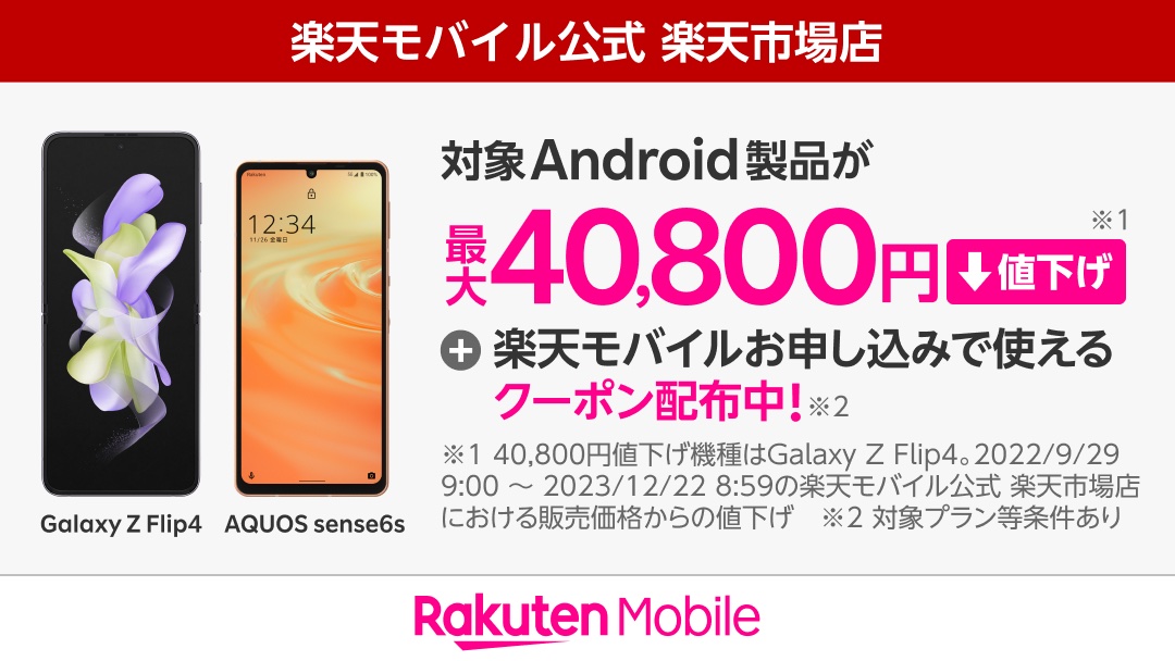 | 楽天モバイル版「Galaxy Z Flip4」と「AQUOS sense6s」が値下げ! |