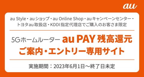 また特典の還元(チャージ)を受けるにはエントリーしたau IDとホームルーターのau IDが特典還元の前月末時点で同一の必要があり、このau IDがスマートフォン(スマホ)など向け決済サービス「au PAY」の利用登録が済んでおり、au PAY残高を受け取れる状態になっている必要があります。なお、対象販売拠点でも沖縄県下は対象外とのこと。