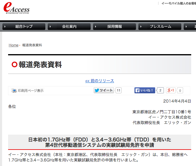 イー・アクセスは4日、総務省に1.7GHz帯と3.4〜3.6GHz帯を用いた実験試験局免許の申請を行ったと発表しています。