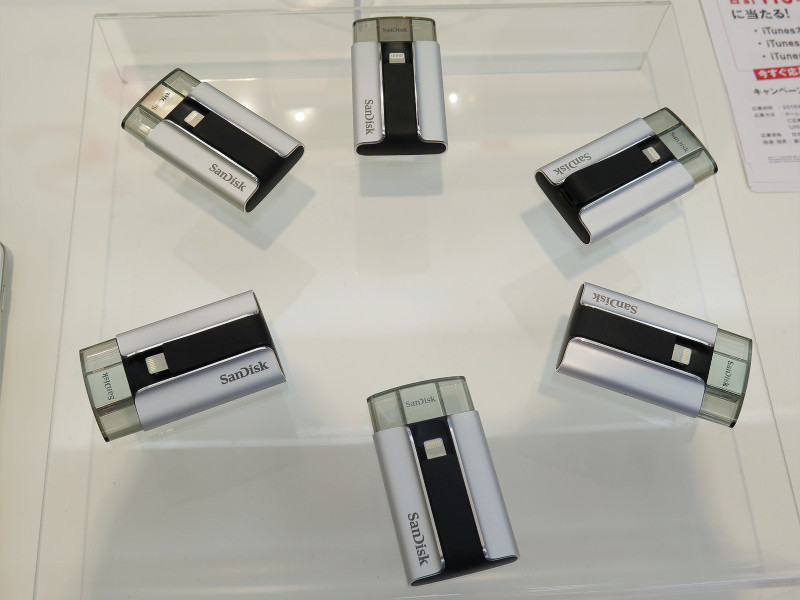 今回の記事では、USBメモリやSDカードといった外部メモリで有名なSanDiskブースにて、Lightningケーブル端子搭載のiPhoneやiPad、iPod touchに対応したLightning対応USBメモリー「iXpand」とAndroid搭載機種全般に対応したmicroUSBサイズと通常サイズの2つのUSB端子を搭載したダブルコネクター搭載USBメモリー「デュアルUSBドライブ3.0」を展示していたので紹介します。