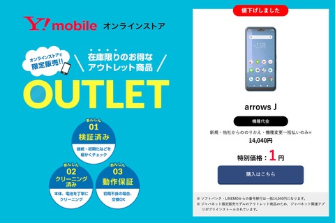 arrows Jはジャパネットたかた限定モデルとしてジャパネットたかたにて販売されていますが、ワイモバイルオンラインストアにてアウトレット品として販売されており、アウトレット品は新規契約や他社から乗り換え(MNP)だけでなく、機種変更でも本体価格14,040円の14,039円割引によって1円となっています。
