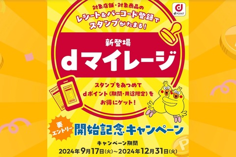 またサービスの提供開始を記念して「dマイレージ開始記念キャンペーン」( https://dpoint.docomo.ne.jp/cp_6/mustbuy/dmileagecp_2409_PP0008/ )を2024年9月17日(火)から2024年12月31日(火)まで開催し、期間中にキャンペーンWebページからエントリーの上、対象商品を購入してレシートとバーコードを登録してスタンプを1個獲得した人のうちの先着20万人にdポイント(期間・用途限定)で50ポイントをプレゼントするということです。