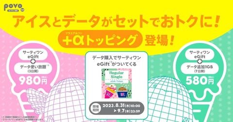 KDDIおよび沖縄セルラー電話は17日、オンライン専用の料金プランとして提供している携帯電話サービス「povo2.0」( https://povo.jp/ )においてサーティワン アイスクリーム レギュラーシングルギフト券(420円相当)とデータトッピング「データ追加0.3GB(24時間)」をセットにしたお試しトッピングを2024年5月17日(金)10:00から5月31日(金)23:59まで提供するとお知らせしています。