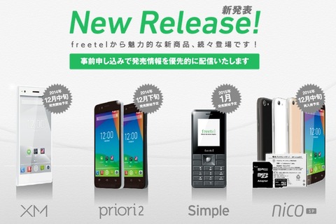 さらに、新製品発売を記念して、今月13日に開始したNTTドコモの回線を借り入れた仮想移動体通信事業者(MVNO)としての携帯電話サービス「freetel mobile(フリモバ)」と新製品を含む全機種対象にSIMカードと同時に購入することで1年間の間月額基本料が割り引かれるお得なキャンペーンを年内限定で実施するとのこと。中にはセットで月額基本料が12 ヶ月無料になるプランも登場しています。なお、キャンペーンの開始は2014年12月2日(火)15:00からを予定しています。