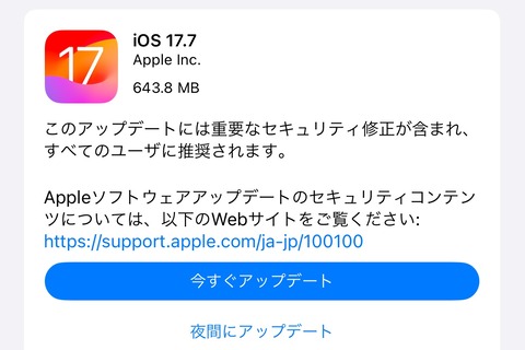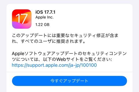 Appleは19日(現地時間)、iPhoneおよびiPod touch向けプラットフォーム「iOS」とiPad向けプラットフォーム「iPadOS」において前バージョン「iOS 17」や「iPadOS 17」の最新版「iOS 17.7.2(21H221)」および「iPadOS 17.7.2(21H221)」を提供開始したとお知らせしています。