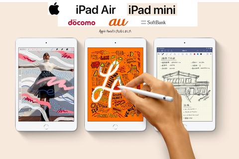 日本でもNTTドコモやau、SoftBank、Appleから3月末に発売される新しいタブレット「iPad mini(第5世代)」(以下、iPad mini 5)および「iPad Air(第3世代)」(以下、iPad Air 3)。なお、日本では従来通り、Wi-Fi+CellularモデルはApple(SIMフリー版)やNTTドコモ、au、SoftBankから、Wi-FiモデルはAppleやSoftBank、各家電量販店などから販売されます。