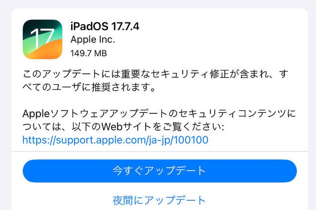| AppleがiPad向けiPadOS 17.7.4をリリース! |