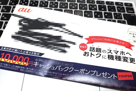 届いたのは9月7日で、auのiPhone 6sを購入し、そのまま維持している回線宛に送られてきました。キャッシュバッククーポンを利用すると、auショップや公式Webストア「